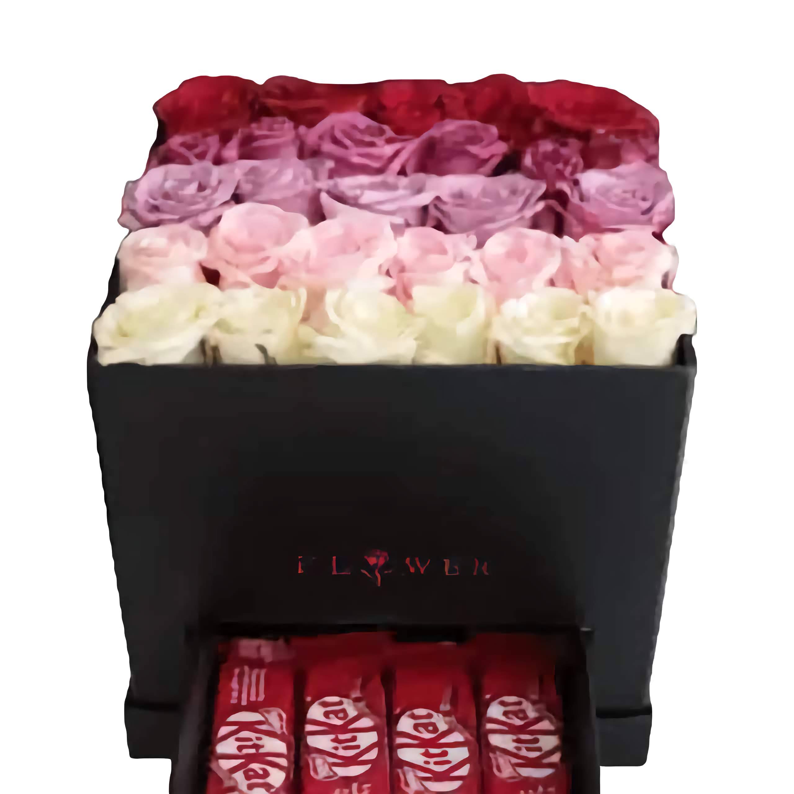 Expertly designed by a professional Nairobi florist, this arrangement features fresh, handpicked roses arranged to perfection alongside delicious KitKat chocolates. The luxury box presentation adds sophistication, making it a ready-to-gift masterpiece.