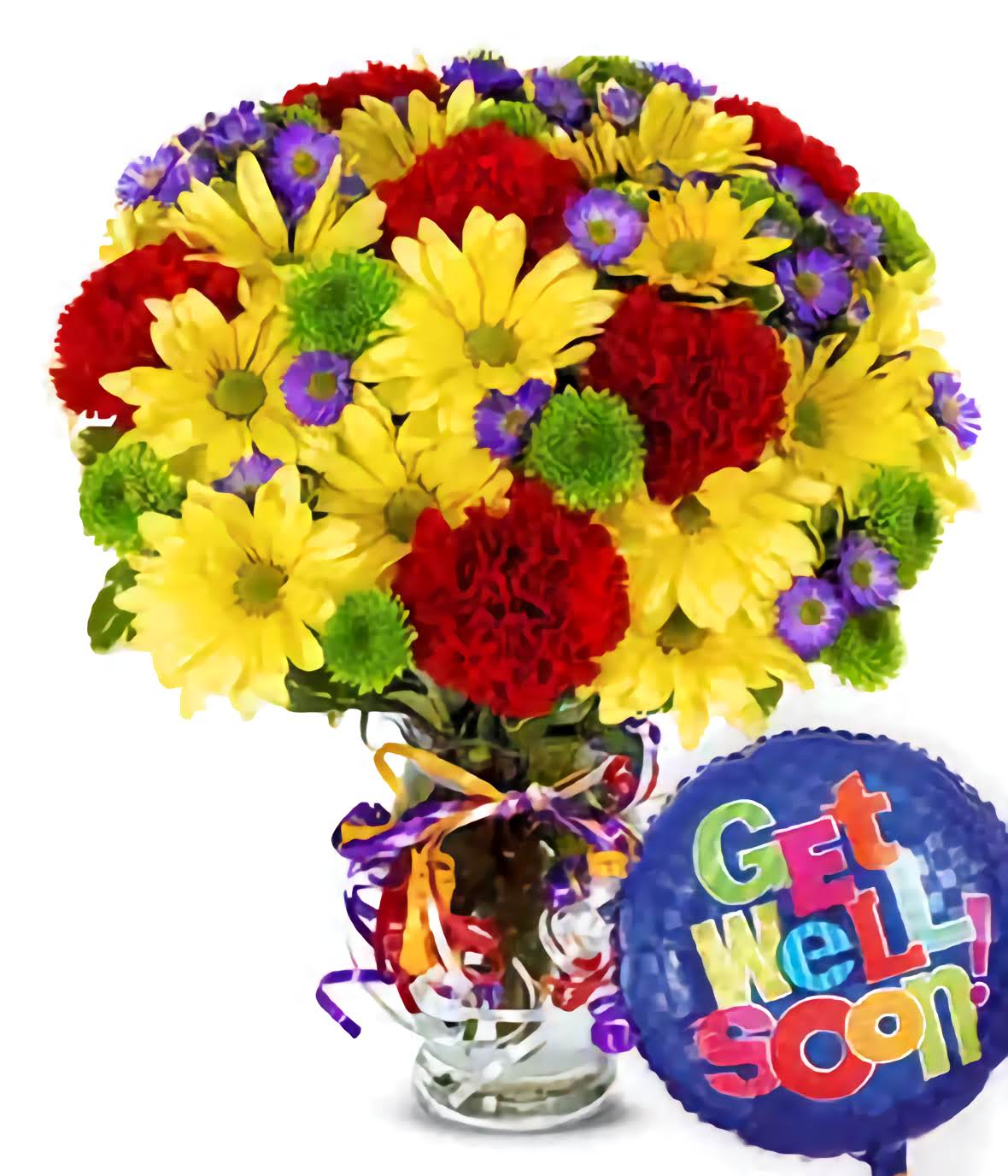 Show your love and support with our Get Well Flowers, a vibrant floral arrangement to uplift spirits. This cheerful bouquet features fresh carnations, chrysanthemums, and purple fillers in a stylish clear vase. Accompanied by a “Get Well Soon” balloon, this thoughtful gift brings warmth, positivity, and encouragement to someone feeling unwell.