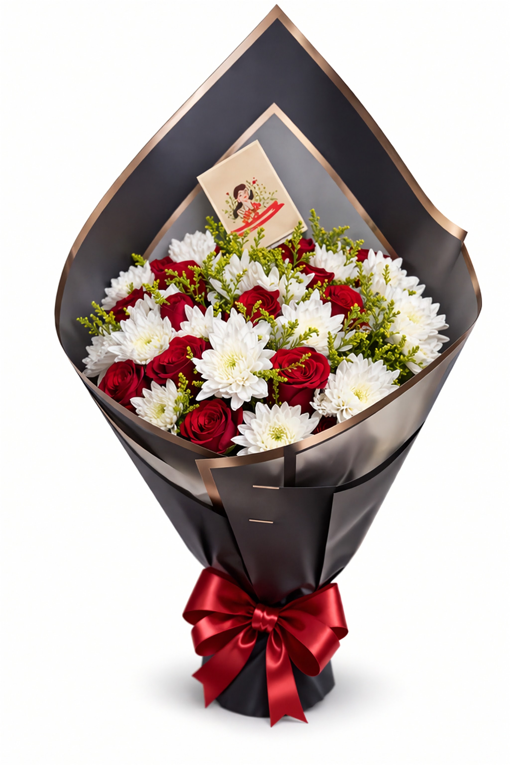 The bold red blooms symbolize passion and love, while the white chrysanthemums represent peace and purity—creating a balanced and elegant bouquet that speaks directly to the heart.
