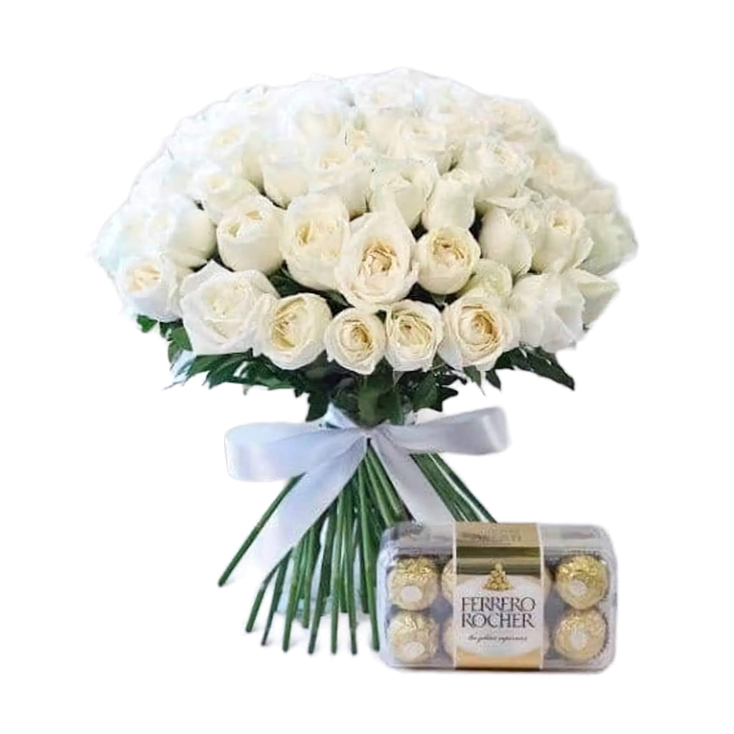 Celebrate love, joy, and special moments with the exquisite Winter Breeze bouquet. This stunning flower arrangement features fresh white roses, symbolizing purity, love, and new beginnings, paired with 16 Ferrero Rocher chocolates for a touch of indulgence. Send Winter Breeze elegance with 50 white roses and 16 Ferrero chocolates. Order same-day in Nairobi for pure love and delightful moments.Whether you’re marking an anniversary, birthday, or Valentine’s Day, this luxury floral gift combo delivers the perfect blend of romance and delight. Order now for same-day flower delivery near me and make any occasion unforgettable.